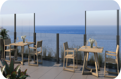 Rimcore specialises in the revolutionary WindStop PRO Glass Railing System which is extendable to 1900mm high to provide a transparent windbreak. It is designed to enhance comfort and enjoyment of occupants or patrons in windswept outdoor dining, entertainment or recreation areas. All glass edges are brilliantly polished. All Aluminium and Glass components fully comply with SA Building Regulations.